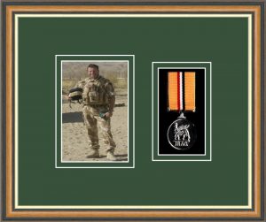 £31.82 Military medal picture frame 315mm x 265mm. Aperture 70mm x 125mm for one coat mounted or individual medal, aperture 95mm x 145mm for one photograph Includes: mahogany frame, glass, forest green front mounts, spacer frame, black back mount, medal fixings.