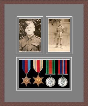 Military medal picture frame 340mm x 420mm. Aperture 220mm x 125mm for four/five coat mounted or individual medals, two apertures 95mm x 145mm for photographs.